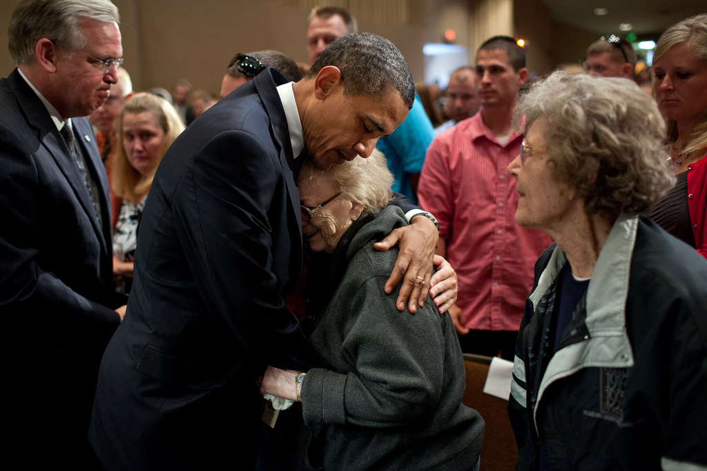 President Obama consoles a woman at the Joplin Community Memorial Service at Missouri Southern University, May 29.
