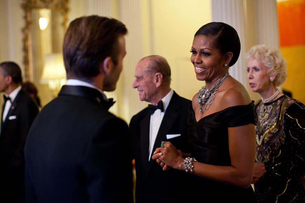 First Lady Michelle Obama greets soccer star David Beckham at a dinner in honor of Queen Elizabeth II at Winfield House in London, May 25