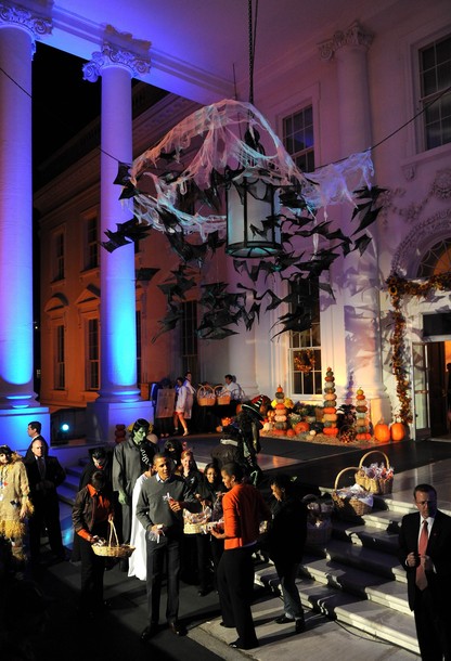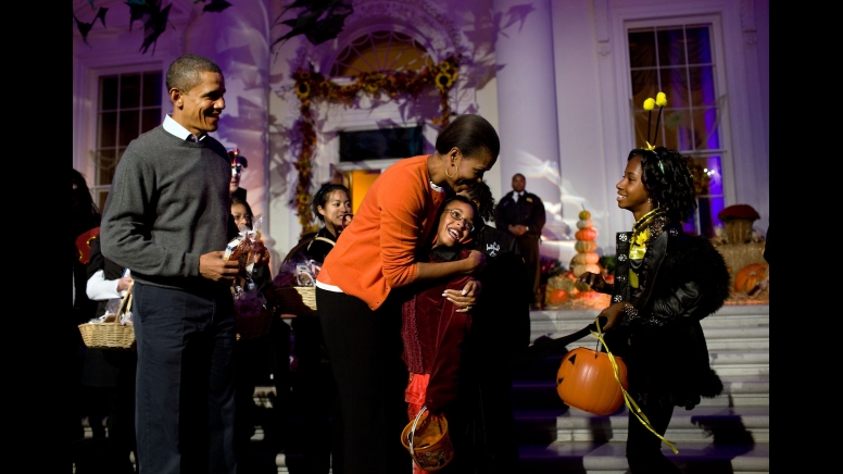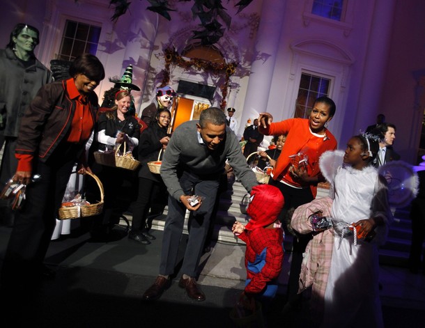 President Barack Obama, First Lady Michelle Obama, and the first lady’s mother Marian Robinson, offer treats to trick-or-treaters to celebrate Halloween on the North Portico of the White House