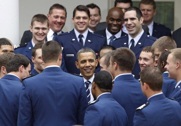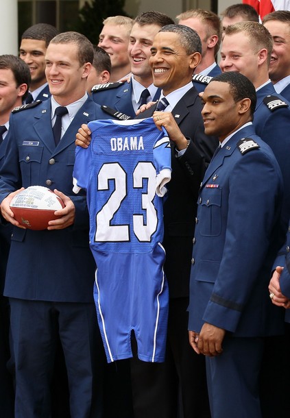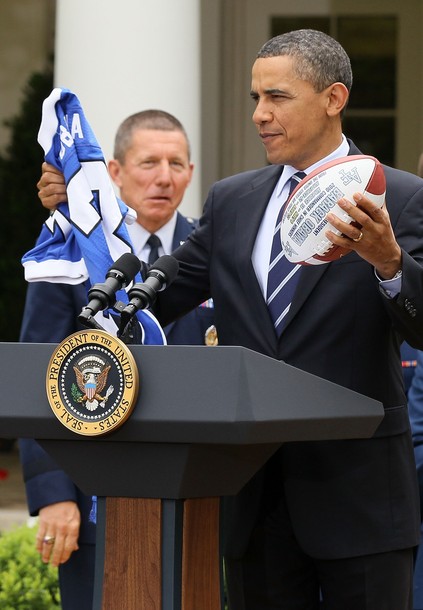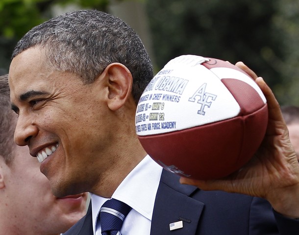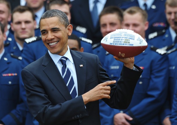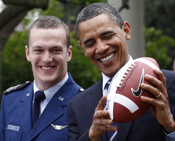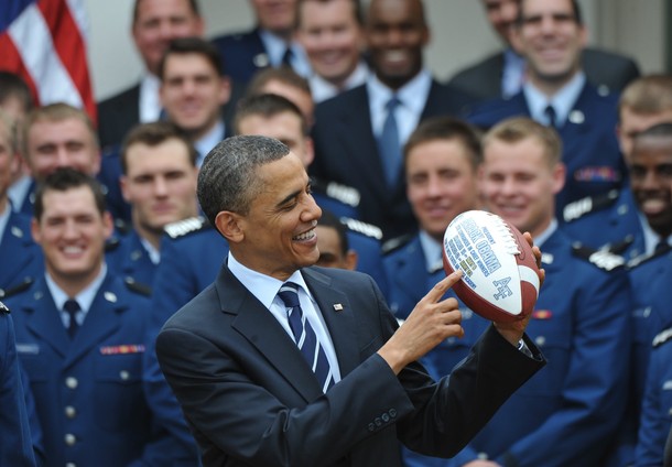 President Obama takes a hand off from Air Force Academy running back Jared Tew