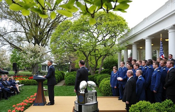 President Obama looks at a football presented to him during a ceremony presenting the Commander-in-Chief Trophy to the Air Force Academy football team in the Rose Garden at the White House, April 18