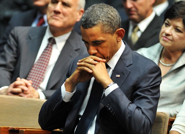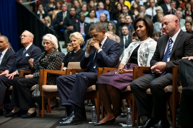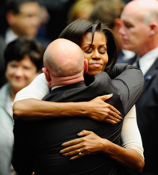 On This Day: President Obama hugs first lady Michelle Obama after speaking at a memorial service at McKale Center on the University of Arizona campus, Jan. 12, 2011, in Tucson, Ariz