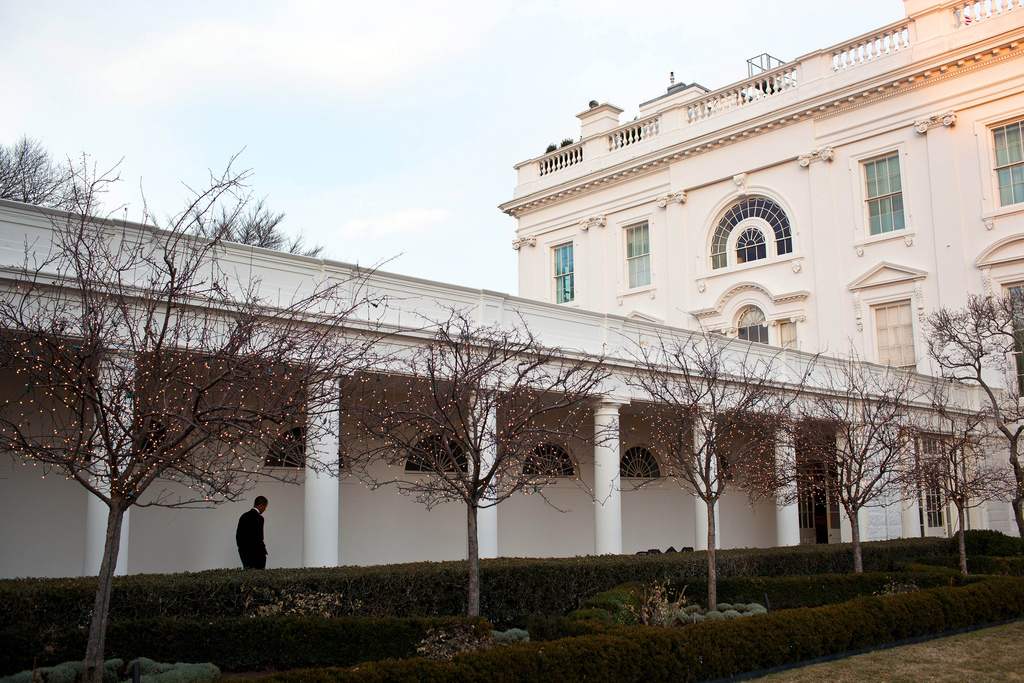 President Barack Obama walks along the Colonnade of the White House en route to the State Dining Room to make a statement about the shooting of Rep. Gabrielle Giffords and others in Tucson, Ariz., Saturday, Jan. 8, 2011. (Official White House Photo by Pete Souza)