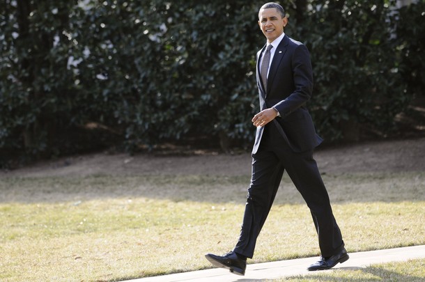 President Barack Obama walks back to the Oval Office of the White House in Washington after a trip to Michigan. Obama was scheduled to meet with members of his National Security team to discuss the events in Egypt.