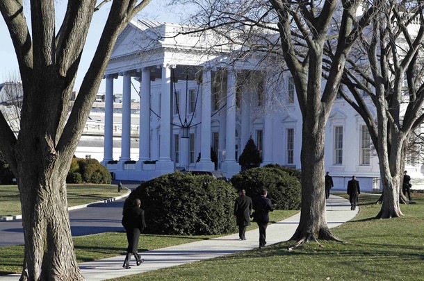 President Barack Obama walks from the Blair House across Pennsylvania Avenue to the White House after meeting with business leaders in Washington on December 15