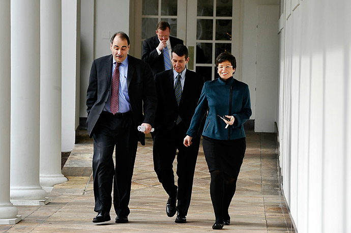 White House advisers Valerie Jarrett, David Plouffe David Axelrod and Press Secretary Robert Gibbs walk along the colonnade near the Oval Office