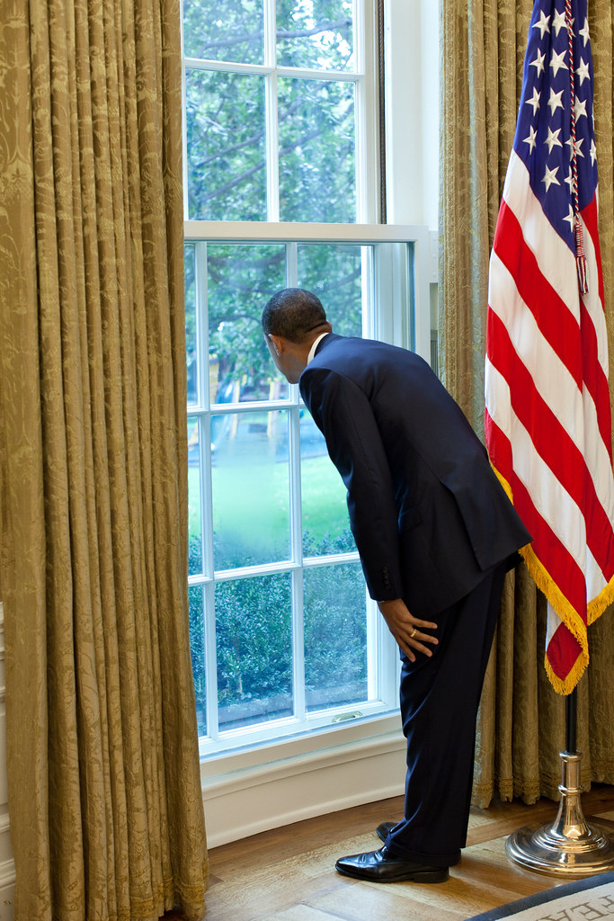President Barack Obama looks out a window in the Oval Office at First Lady Michelle Obama who was being interviewed on the South Grounds of the White House, Oct. 5, 2010. (Official White House Photo by Pete Souza)