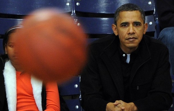 President Barack Obama watches a game between the Oregon State University Beavers and the Howard University Bison on November 27, at Howard University in Washington