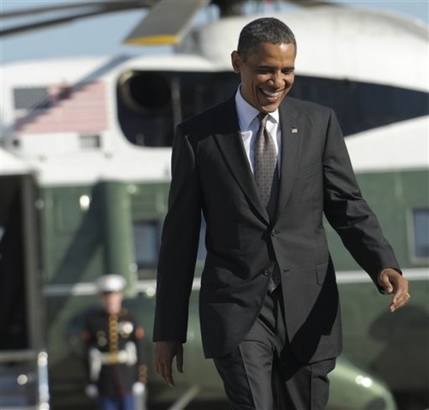 President Barack Obama hugs US Trade Representative Ron Kirk as Dallas Cowboys hall-of-fame football great Emmitt Smith watches at right during a fundraiser in Dallas, Tuesday, Oct. 4