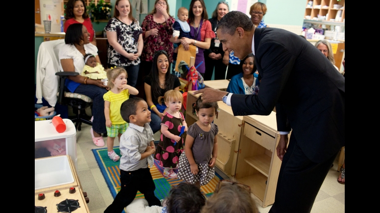 President Barack Obama talks with children during a tour of the Lab School’s early childhood education classrooms at Eastfield College in Mesquite, Texas, Oct. 4, 2011. (Official White House Photo by Pete Souza)