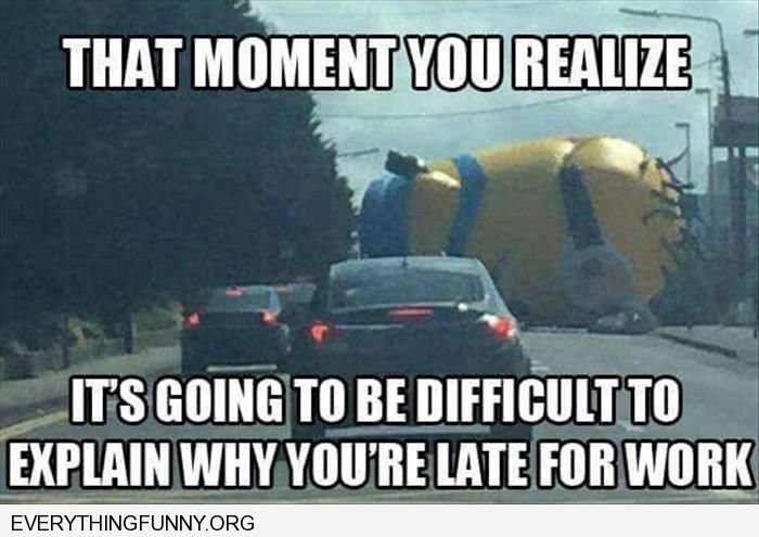 Yeh, see what had happened wuz… um this giant minion was laid out across the road and… um… oh never mind!
