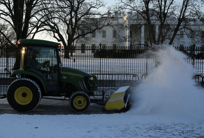 Workers plough snow from the sidewalk in front of the White House in Washington.