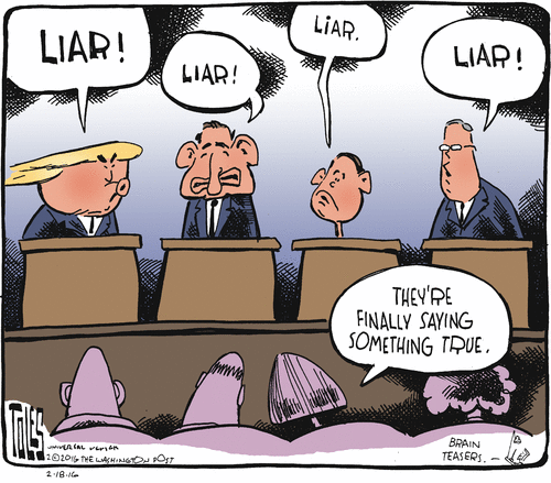 I NOTICED LAST NIGHT AT THE CNN TOWN HALL AND THERE SHOULD BE MORE OF IT…TRUMP IS VERY UNCOMFORTABLE WITH THAT SCENARIO…I THINK HE’S AFRAID OF THE QUESTIONS AND WHEN HE CAN’T ANSWER…HE CIRCLES THE WAGONS BY CHANGING THE SUBJECT. HE NEEDS TO BE PINNED ON POLICY…THE DEBATES ARE STUPID AND SHALLOW AND DON’T GO FAR ENOUGH TO CHALLENGE THE CANDIDATES….TRUMP NEEDS TO BE PINNED IO THE WALL…YOU KNOW THAT GAME WHERE YOU SEEK TO PIN THE TAIL ON THE JACKASS!