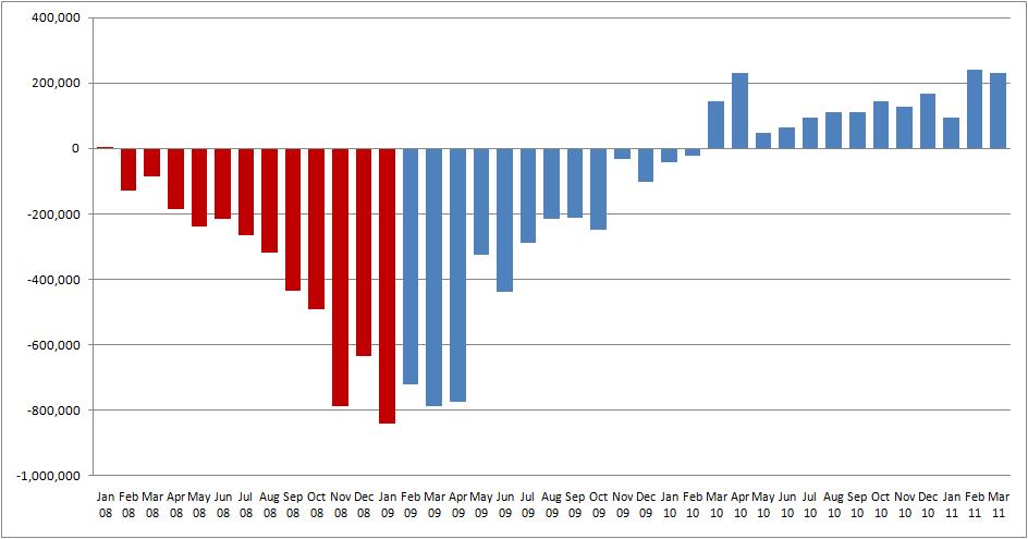 Steve Benen: “….here is a chart showing monthly job losses/gains in the private sector since the start of the Great Recession. The image makes a distinction - red columns point to monthly job totals under the Bush administration, while blue columns point to job totals under the Obama administration.”