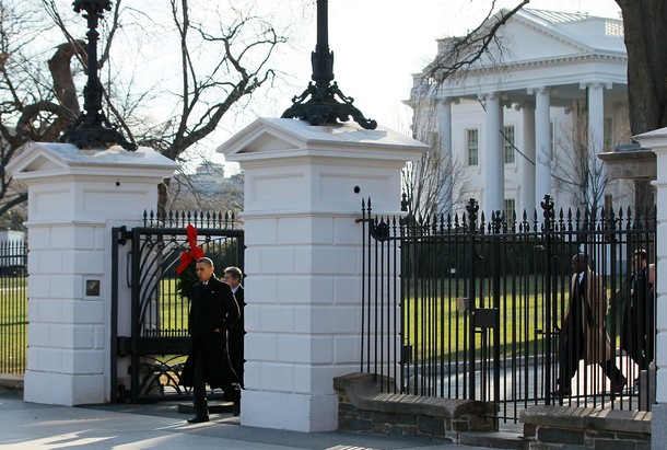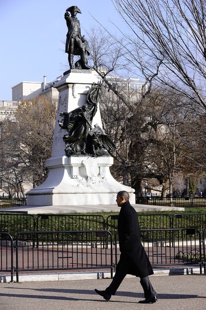President Obama walks to Blair House to attend a Christmas Party hosted by the National Security Council, Dec 13