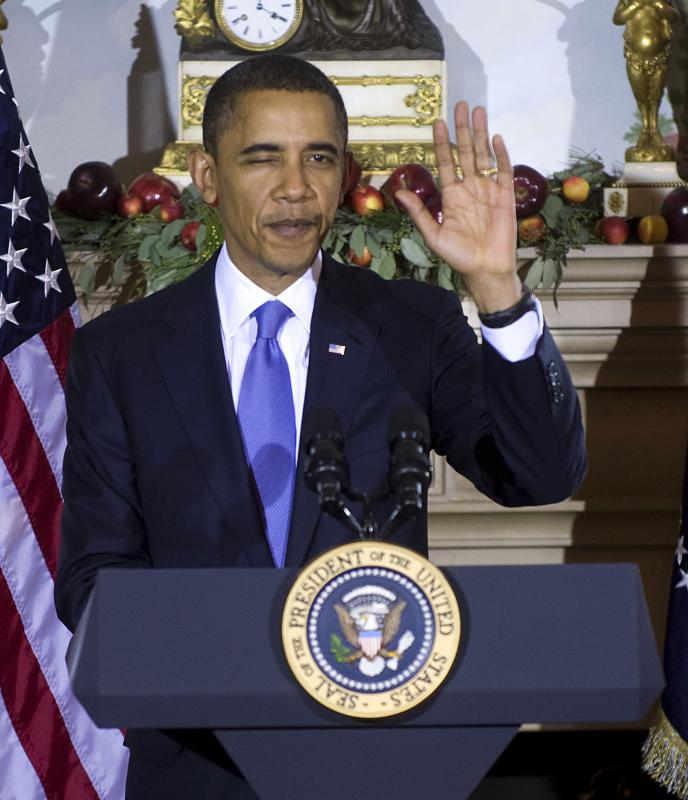 President Barack Obama waves and winks to the news media after delivering remarks during a luncheon for newly elected governors at the Blair House in Washington, DC on December 2, 2010. UPI/Shawn Thew/Pool