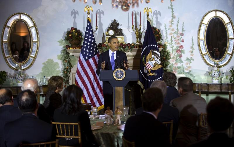 President Barack Obama attends a National Security Council holiday party at Blair House, across the street from the White House, December 9
