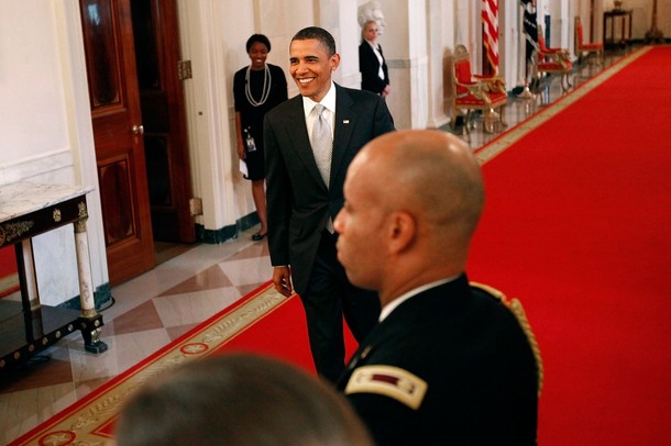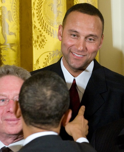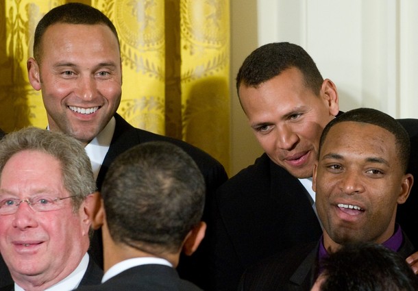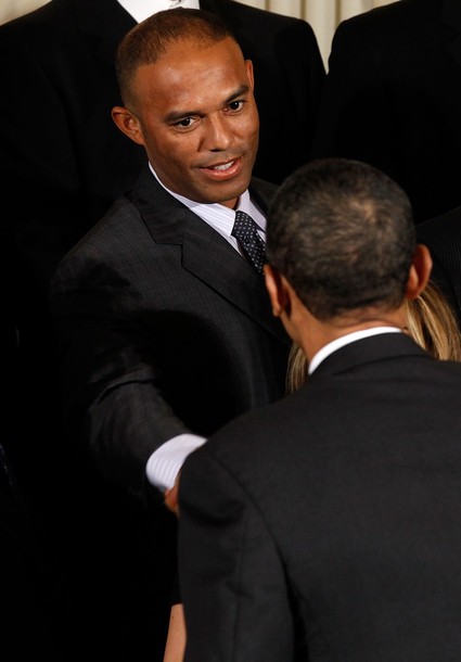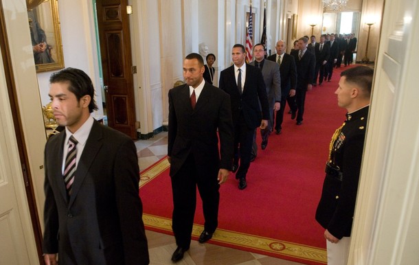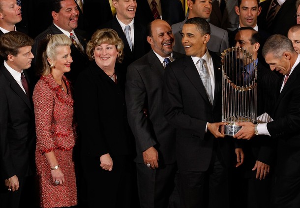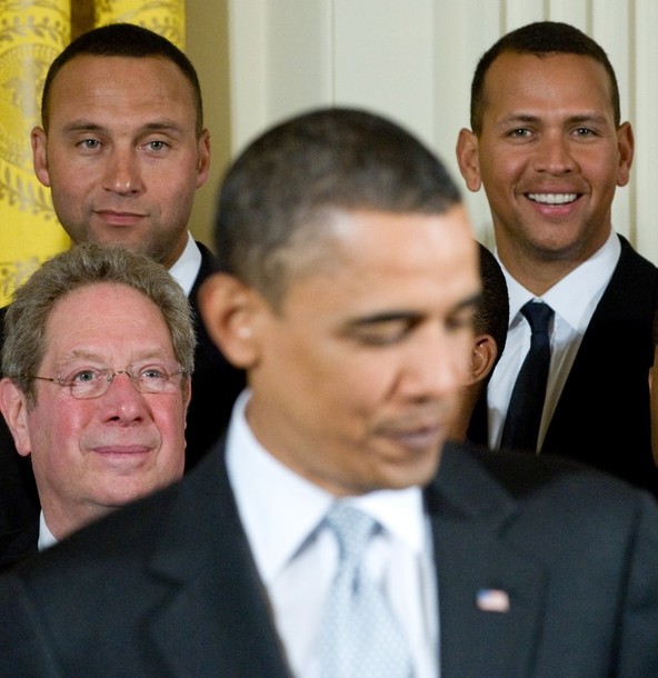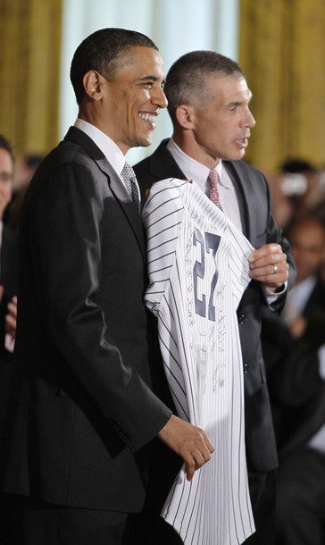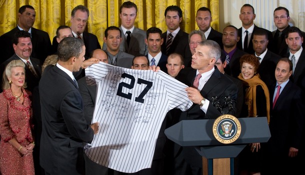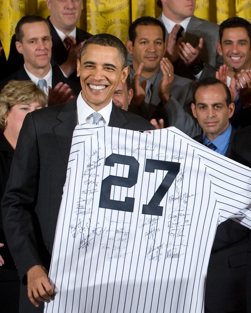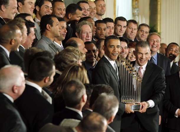 President Barack Obama at an event with the New York Yankees, the 2009 World Series champions, in the East Room of the White House in Washington, DC, April 26, 2010.