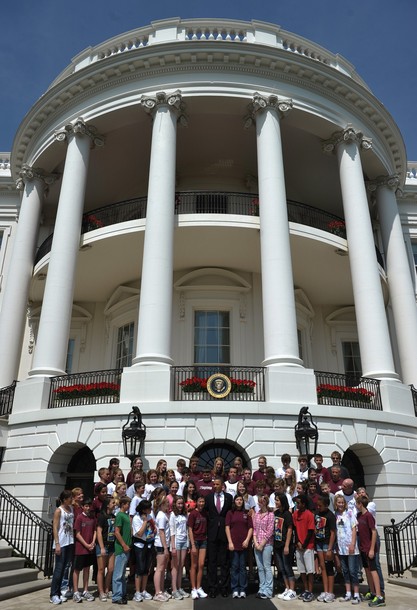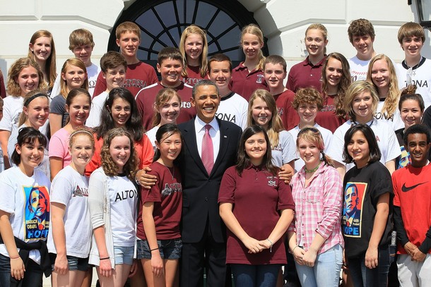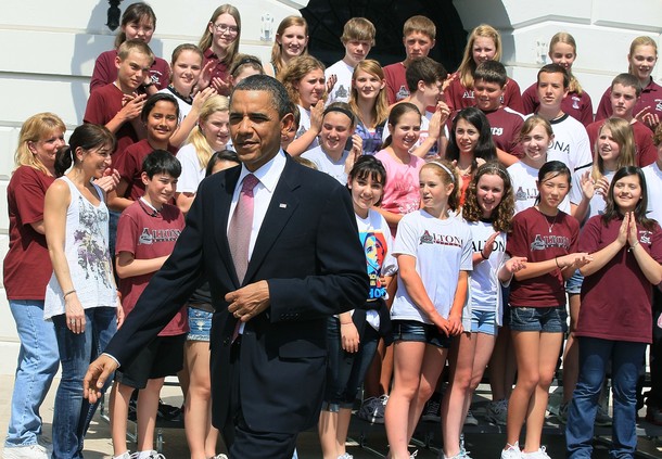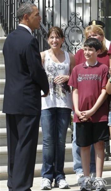 President Obama meets students from Altona Middle School in Longmont, Colorado at the White House, April 11. The President received a letter from Shalini Schane, second from left, who was worried worried that her son Adam, right, would have his trip canceled if there were to be a government shutdown last Friday.